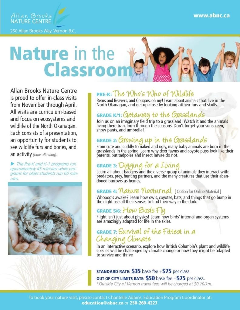 Allan Brooks Nature Centre offers visits to your classroom from November through April. These programs have been designed to suit each grade level from pre-k to grade 7, are curriculum based and focus on the ecosystems and wildlife of the North Okanagan. Each consists of a presentation, an opportunity for students to see wildlife furs and bones, and participate in an activity (time allowing). The Pre-K and K-1 programs run approximately 45 minutes while programs for older students run 60 minutes.
